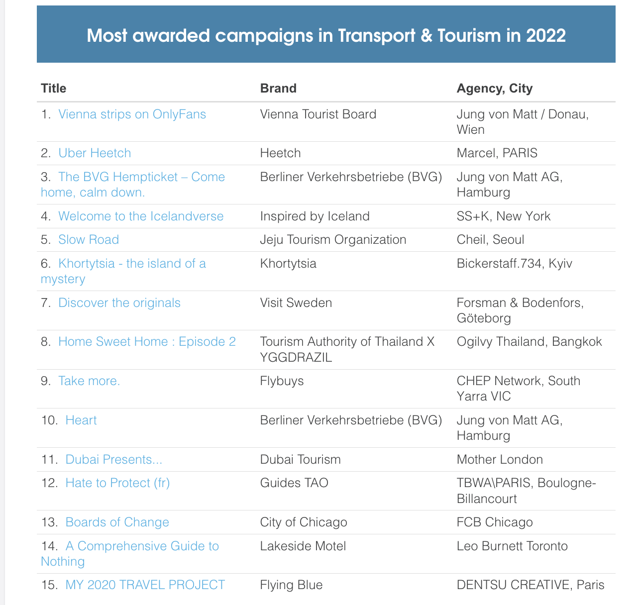 The campaign was ranked the #5 creative campaign of the year by WARC and #1 tourism campaign in 2022 by TheDrum.