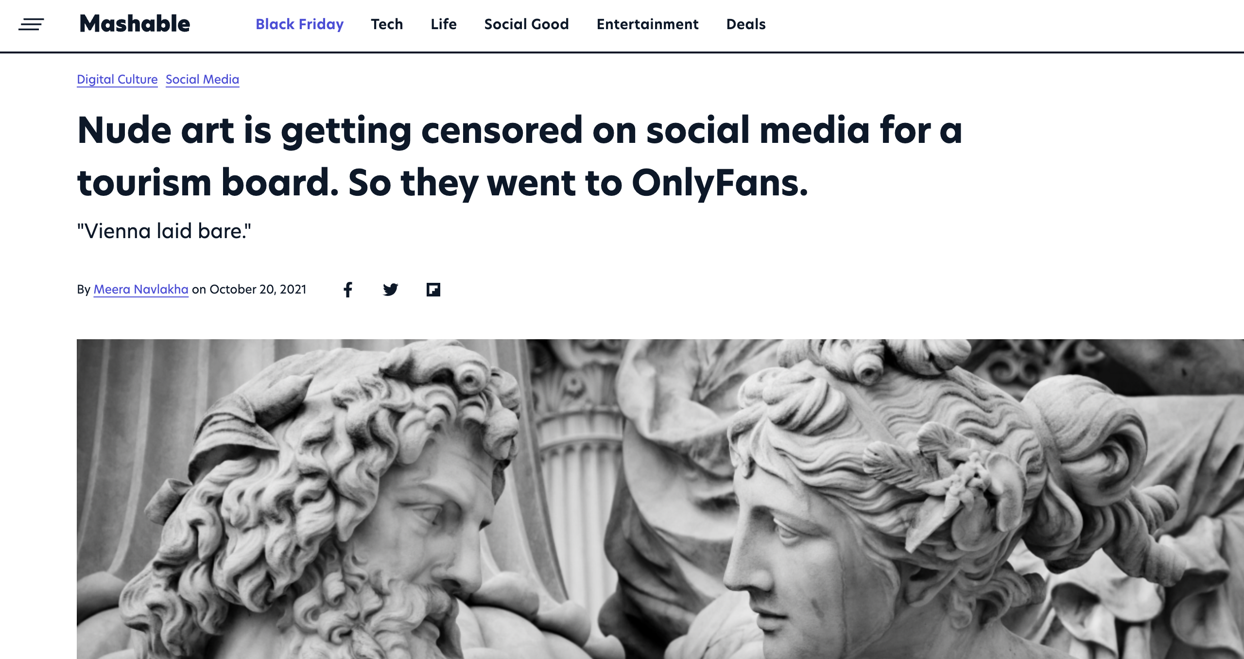 Who decides what art is allowed to do? Nowadays, increasingly, algorithms. Vienna, a city that is home to some of the world’s most iconic artworks by Schiele, Klimt, Moser and many more, experienced that while trying to show those very artworks in their social media networks. Algorithms labeled them as “pornographic”. The result? Deleted posts and blocked accounts. We wanted to protest against that. So we published the “explicit” art on OnlyFans. A platform that allows 18+ content. Starting a global discussion on who is allowed to censor art. More than 2,500 articles were published. Reaching more than 760 million people.